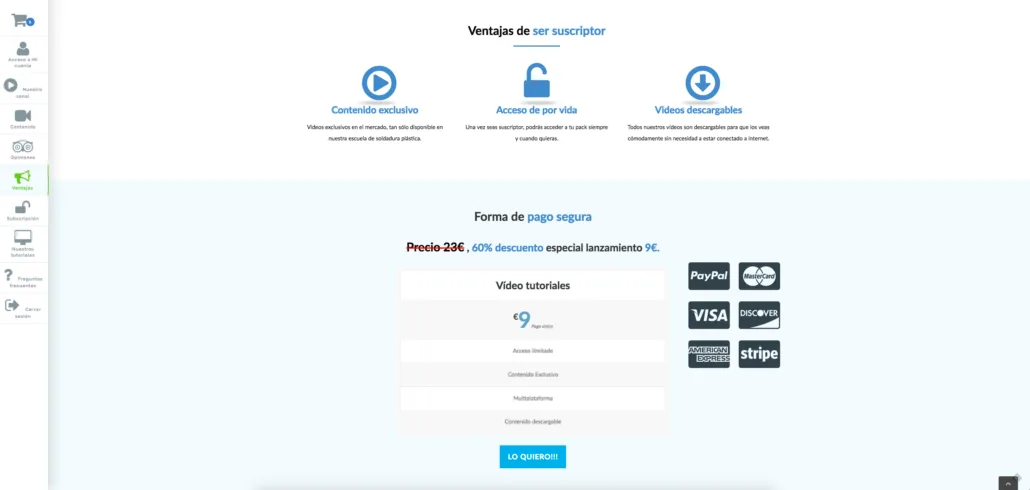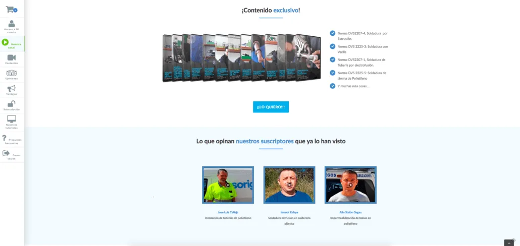 En conjunto con nuestro cliente, la idea inicial fue suya, poco a poco fuimos definiendo cómo queríamos mostrar los video-tutoriales. Para ello creamos la web de Escuela Soldadura . La web consta de testimonios de otros usuarios, videos demostrativos y un video club al cual sólo se puede acceder siendo suscriptor y previo pago a través de tarjeta bancaria, transferencia o Paypal. www.escuelasoldadura.com