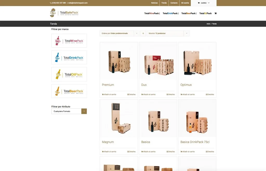 El diseño web de TotalSafePack es una parte del proyecto TotalSafePack, donde renovamos por completo la imagen corporativa de TotalWinePack, ampliando ahora las familias de packaging especial para botellas de esta marca. Por lo que en Blixt nos encargamos de diseñar toda la imagen corporativa de la nueva marca TotalSafePack, que a su vez engloba las submarcas TotalOilPack, TotalBeerPack, TotalDrinkPack y TotalWinePack. La página web del grupo Total, es ahora tienda online, diseñada y desarrollada en conjunto con toda la nueva imagen corporativa y pensando en que la navegación y experiencia del usuario sea lo más cómoda posible.
